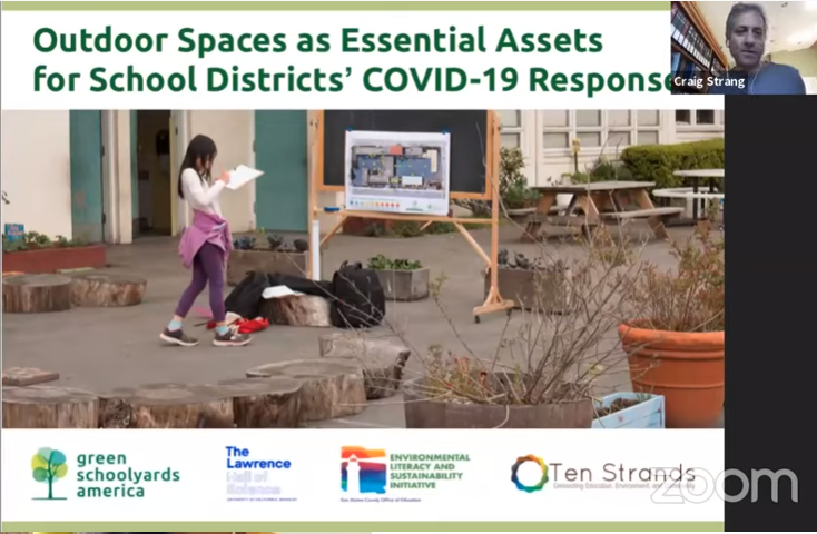 16 Jun green schoolyards Posted at 19:04h in by Belisa Rotondi Uma criança anda pelo jardim desenhando. No canto superior direito há a miniatura da tela de um homem falando.